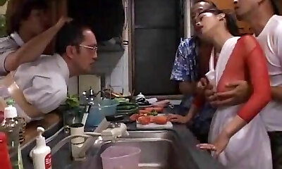 Japanese whore shoves two schlongs in her mouth during gangbang